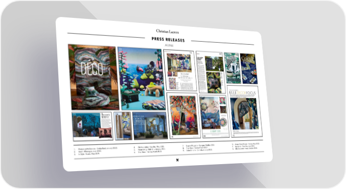 PRESS RELEASES LIFESTYLE 01. 02. 06. 07. 10. 11 . 03. 04. 05. 08. 09. 12. 1. Maisons et Ambiances - Switzerland, January 2020. 4. Elle Decoration - Pays-Bas, May 2022. 7. Esquire Magazine - Espagne, October 2022. 10. Marie Claire Maison - France, May 2022. 2. Ideat - Allemagne, June 2022. 5. Miami Living - Etats-Unis, January 2023. 8. Viva Deco - France, March 2023 11 . Residence - Pays-Bas, June 2022. 3. In Style - Russia, May 2019. 6. Viva Deco - France, March 2023. 9. Style At Home - Canada, January 2022. 12. Elle Decoration - Inde, October 2022.