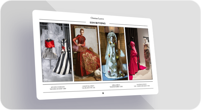 EXHIBITIONS y © Crédits Grégoire Alexandre © Crédits Filep Motwar © Crédits George Pimentel © Crédits Gautier Deblonde ARTS DÉCO MUSEUM’S HASSELT’S MUSEUM’S MET MUSEUM’S GALLIERA MUSEUM’S “HISTOIRES DE MODE” 2007 “HAUTE-A-PORTER” 2016 “HEAVENLY BODIES” 2018 “1997 - FASHION BIG BANG” 2023
