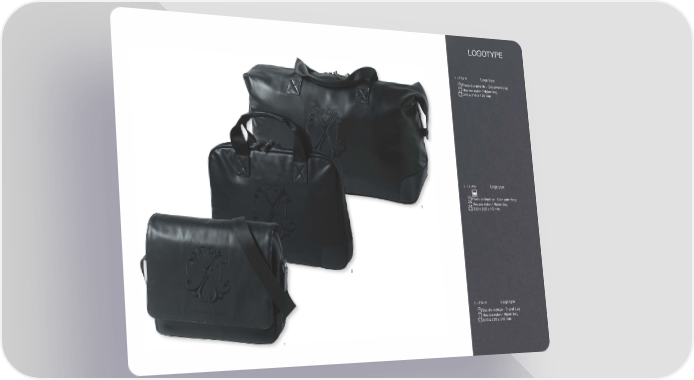 LOGOTYPE 1 L TD416 Logotype Porte-documents - Document bag 8 fl. Housse nylon / Nylon bag [J 350 x 295 x 125 mm 2 LTL416 Logotype 8 Porte-ordinateur - Computer bag fl. Housse nylon / Nylon bag [J 390 x 285 x 45 mm 3 LTB416 Logotype Sac de voyage - Travel bag 8 fl. Housse nylon / Nylon bag [J 530 x 270 x 340 mm