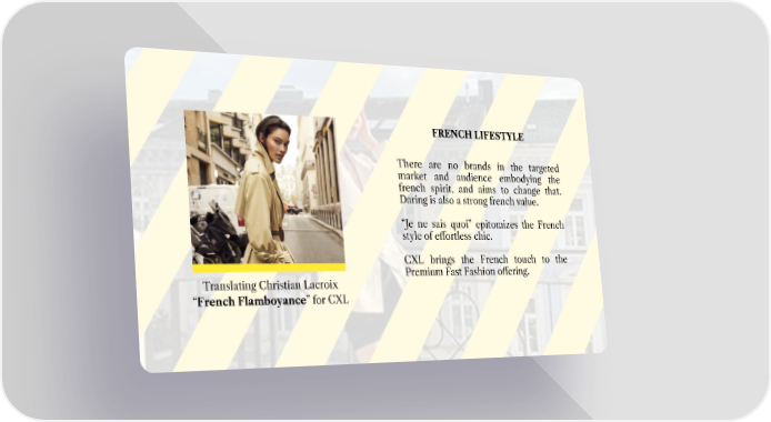 FRENCH LIFESTYLE There are no brands in the targeted market and audience embodying the french spirit, and aims to change that. Daring is also a strong french value. “Je ne sais quoi” epitomizes the French style of effortless chic. CXL brings the French touch to the Premium Fast Fashion offering. Translating Christian Lacroix “French Flamboyance” for CXL