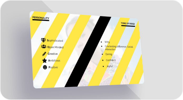 PERSONALITY TONE OF VOICE Sophisticated ● Witty ● Celebrating difference, Social Open Minded interaction Creative ● Daring ● Confident Ambitious ● Joyful Positive