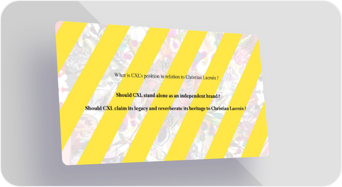 CXL by Christian Lacroix | Brandbook Page 5 Page 7What is CXL’s position in relation to Christian Lacroix ? Should CXL stand alone as an independent brand ? Should CXL claim its legacy and reverberate its heritage to Christian Lacroix ?