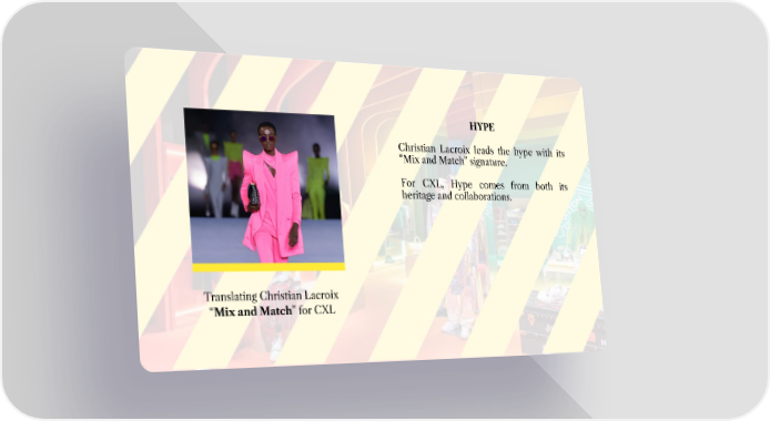 HYPE Christian Lacroix leads the hype with its “Mix and Match” signature. For CXL, Hype comes from both its heritage and collaborations. Translating Christian Lacroix “Mix and Match” for CXL