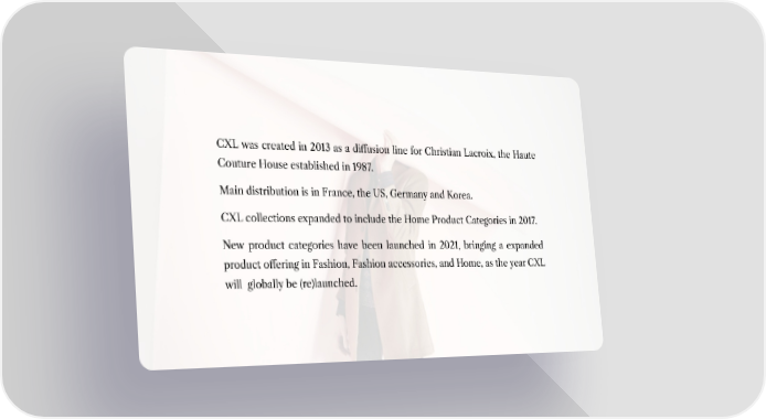 CXL was created in 2013 as a diffusion line for Christian Lacroix, the Haute Couture House established in 1987. Main distribution is in France, the US, Germany and Korea. CXL collections expanded to include the Home Product Categories in 2017. New product categories have been launched in 2021, bringing a expanded product offering in Fashion, Fashion accessories, and Home, as the year CXL will globally be (re)launched.