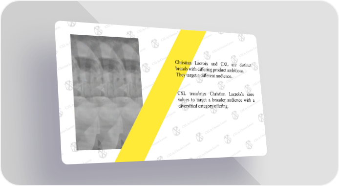 Christian Lacroix and CXL are distinct brands with differing product ambitions. They target a different audience. CXL translates Christian Lacroix’s core values to target a broader audience with a diversified category offering.