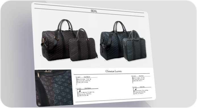 SEAL 1 2 3 4 1 LTB625Y Seal Brown 3 LTB625J Seal Grey Sac de voyage - Travel bag Sac de voyage - Travel bag Housse nylon / Nylon bag Housse nylon / Nylon bag 560 x 250 x 300 mm 560 x 250 x 300 mm 2 LTL625Y Seal Brown 4 LTD625J Seal Grey Porte-ordinateur - Computer bag Porte-documents - Document bag Housse nylon / Nylon bag Housse nylon / Nylon bag 400 x 30 x 270 mm 400 x 140 x 300 mm 5050
